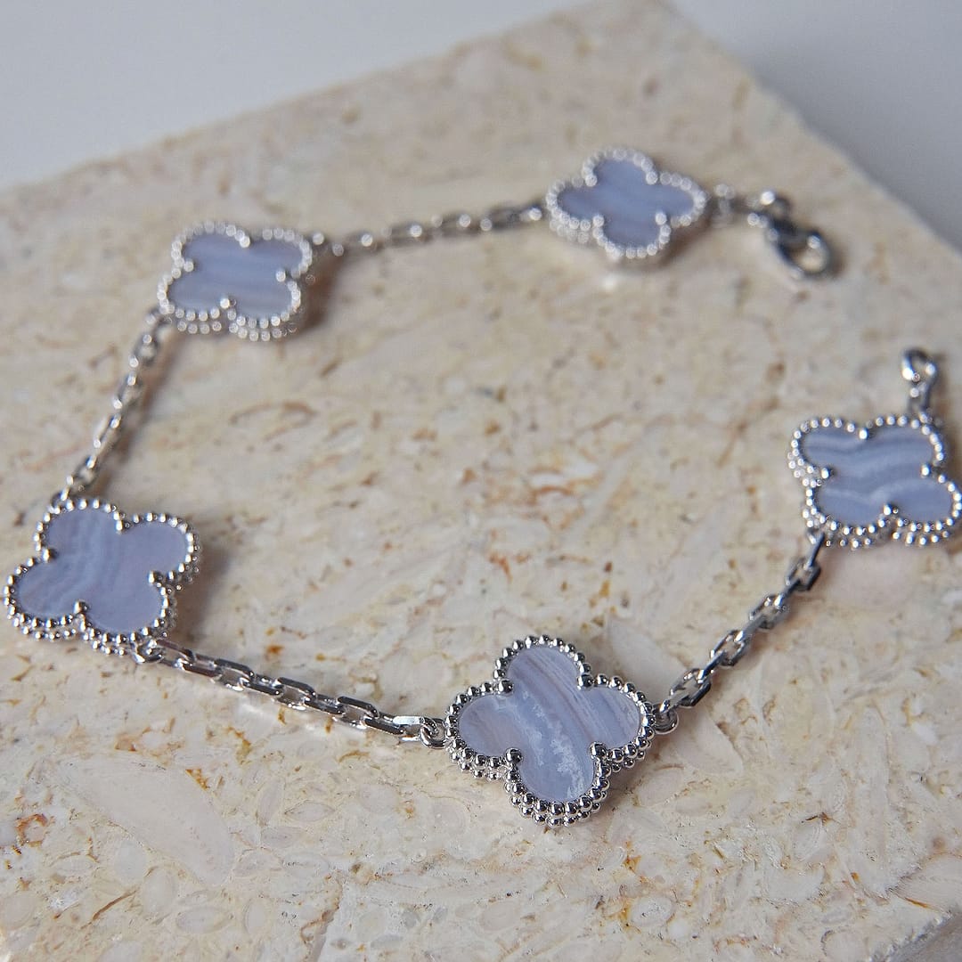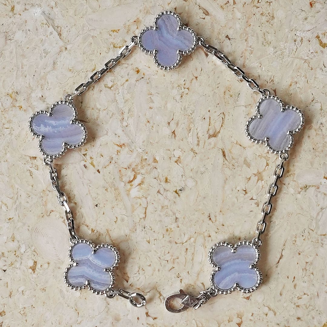 Our Blue lace agate bracelet is crafted with platinum which is more expensive than gold and designed for those who appreciate high-quality craftsmanship. These stunning earrings feature intricate details that showcase the artistry of VCA, while the genuine chalcedony offers not only elegance but also powerful protective properties. Perfect for sensitive skin, our hypoallergenic design ensures comfort without compromising style.